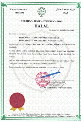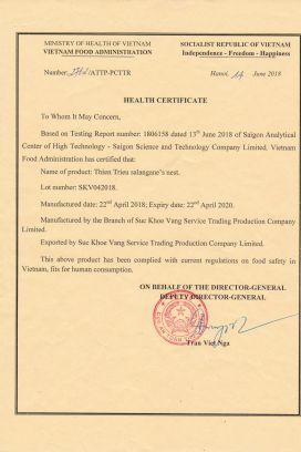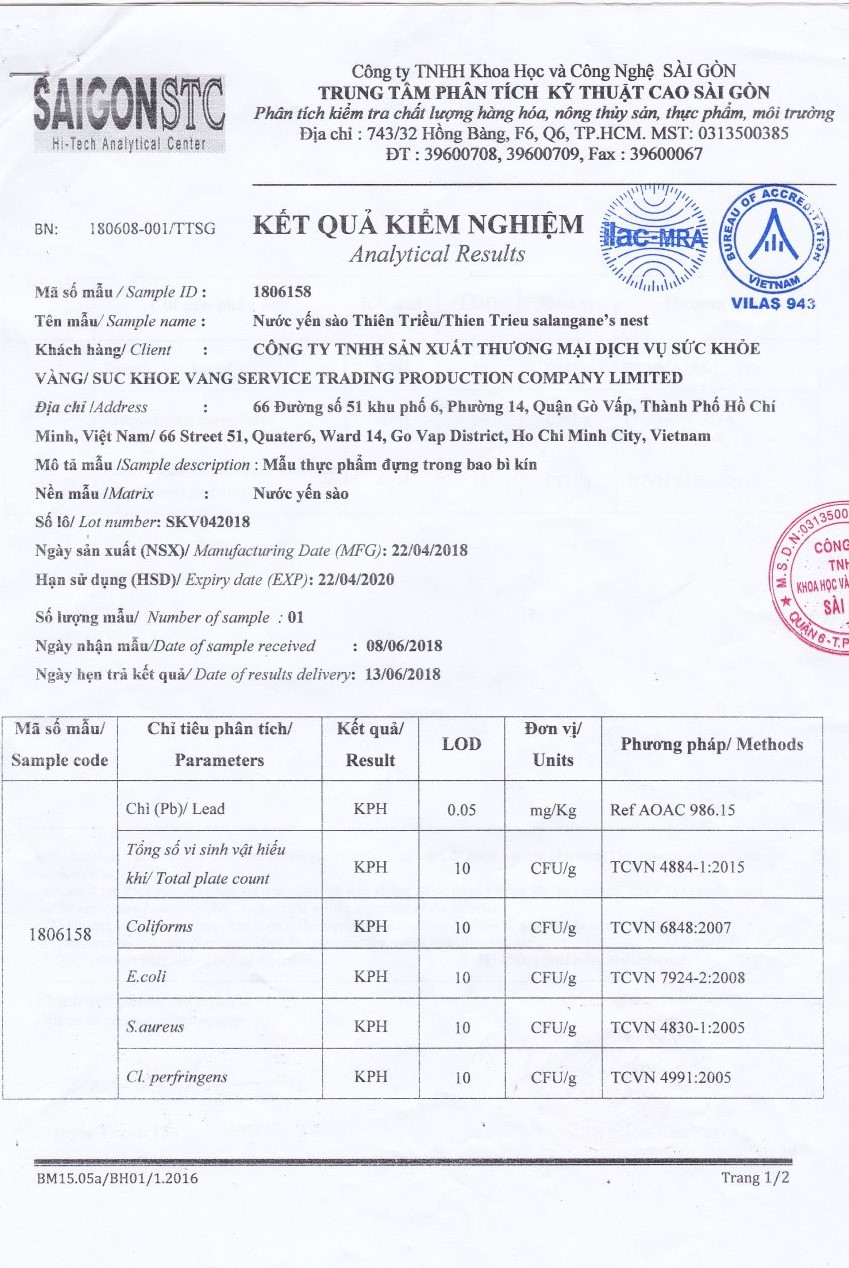 Sản phẩm Nước Yến Sào Thiên Triều là nhãn hiệu cao cấp của công ty Sức Khỏe Vàng, với 2 nhà máy sản xuất tọa lạc tại Hóc Môn và Củ Chi TP, Hồ Chí Minh và bao tiêu chuỗi nhà yến rải rác từ Phan Rang - Phú Yên - Bình Thuận. Sản phẩm được sản xuất trên dây chuyền khép kín, tự động, hiện đại và được kiểm nghiệm nghiêm ngặt sau khi sản xuất. Toàn bộ sản phẩm yến sào của công ty Sức Khỏe Vàng đều được cấp giấy chứng nhận quốc tế như FDA, HACCP, HALAL cũng như nhiều chứng chỉ đạt chuẩn tại Việt Nam, nhằm đảm bảo chất lượng và an toàn thực phẩm cho khách hàng.