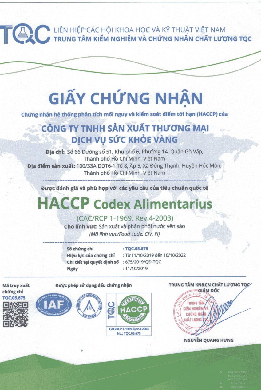 Sức Khỏe Vàng là một trong những công ty hàng đầu về sản xuất, phân phối và xuất khẩu các sản phẩm chất lượng cao trong lĩnh vực yến sào tại Việt Nam. Được thành lập từ 2018 với mục tiêu đem đến cho người tiêu dùng sản phẩm yến sào chất lượng, bổ dưỡng; đến nay hệ thống chi nhánh và đại lý của Sức Khỏe Vàng đã phát triển rộng khắp và trải dài trên toàn bộ lãnh thổ Việt Nam và 8 quốc gia trên thế giới.